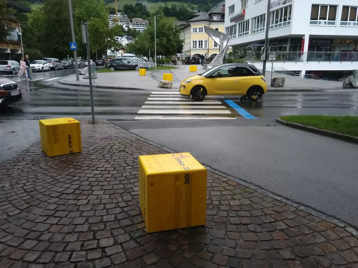 Prägendes Element der Pop-Up Begegnungszone ist der gelbe Würfel. Gelbe Farbe sorgt für Aufmerksamkeit, produziert aus Schaltafeln. Symbolisch wird damit die noch junge Idee, wie es denn letztlich werden soll umrahmt und geformt. Auch symbolisiert der Würfel ein wesentliches Element vieler Strategiespiele, wenn der Würfel fällt, dann wird ein Spielzug gemacht. Dann wandern die Würfel zum nächsten Spieler, und so sollen auch die Würfel in St. Johann mobil sein, als Sitzgelegenheiten, als Fotomotive und damit Dynamik symbolisieren.