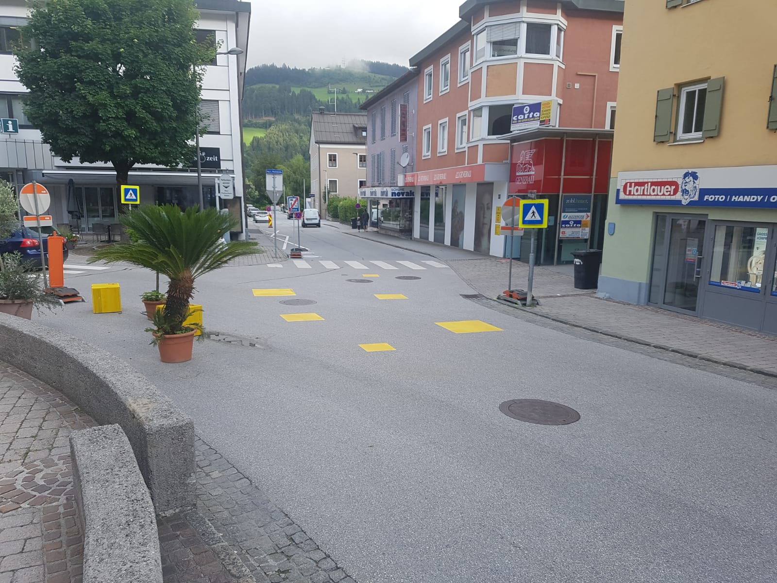 Bodenmarkierungen und Pflanzen tragen zur Verkehrsberuhigung in der Begegnungszone bei.