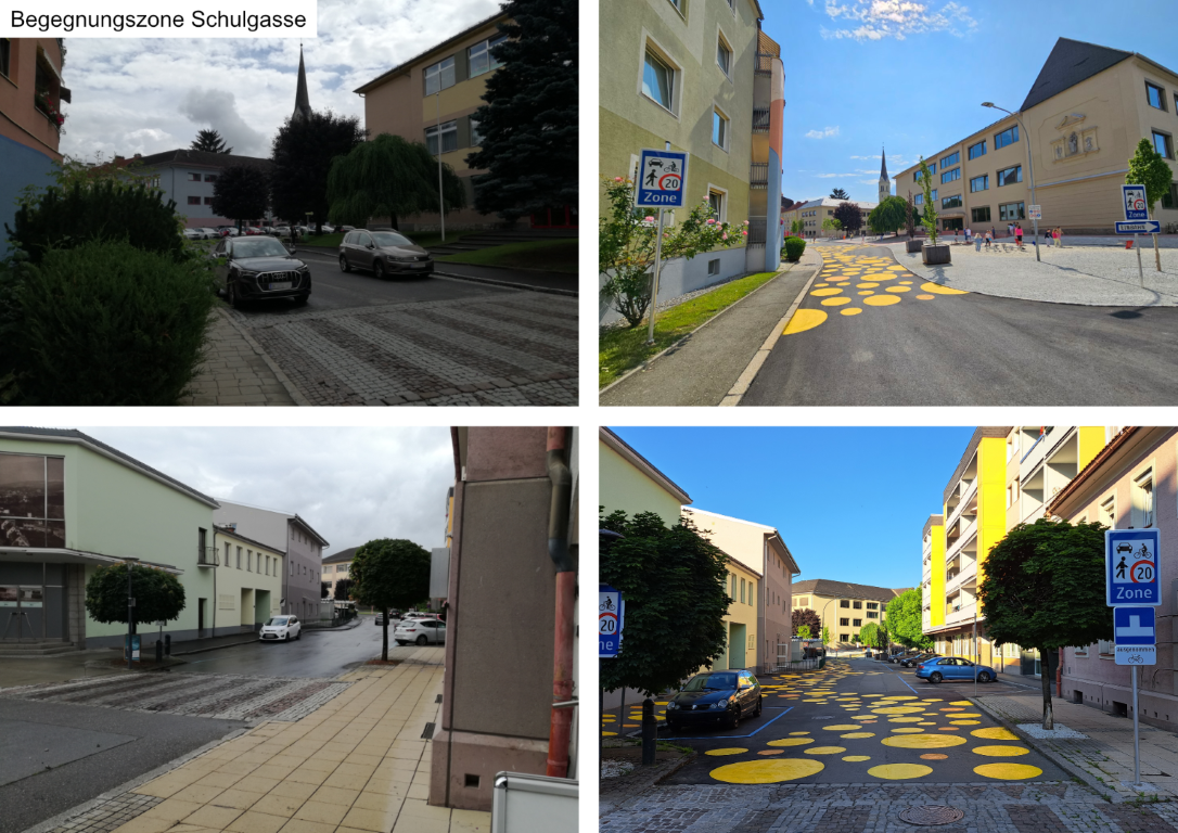 Mit der Neugestaltung der Schulgasse und dem Bereich Bahnhofstraße / Platzlmarkt zu modernen Begegnungszonen wurde ein zentrales Anliegen des Fußverkehrskonzepts umgesetzt. In diesen Bereichen teilen sich Fußgänger:innen, Radfahrer:innen und Autofahrer:innen den Straßenraum gleichberechtigt – mit reduzierter Geschwindigkeit und erhöhter Rücksichtnahme. Das schafft mehr Sicherheit und zugleich ein angenehmeres Stadtbild.