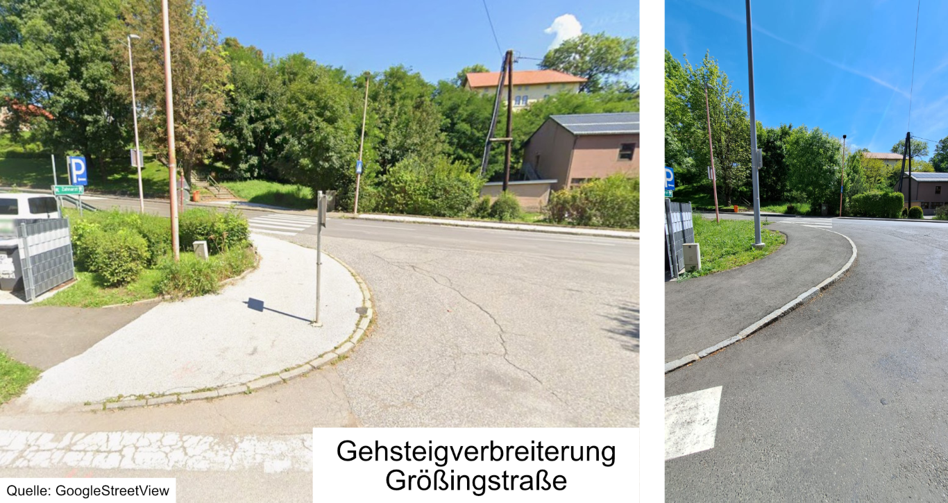 Im Bereich L537 / Kirchengasse / Größingstraße wurde der Aufstellbereich für Fußgänger:innen verbreitert und die Sichtverhältnisse deutlich verbessert. Ebenso erfolgte eine Verbreiterung des Verbindungsweges von der Größingstraße / Schulgasse zur L537 in Richtung Platzlmarkt – eine Maßnahme, die den täglichen Fußweg vieler Zeltweger:innen sicherer und komfortabler macht.