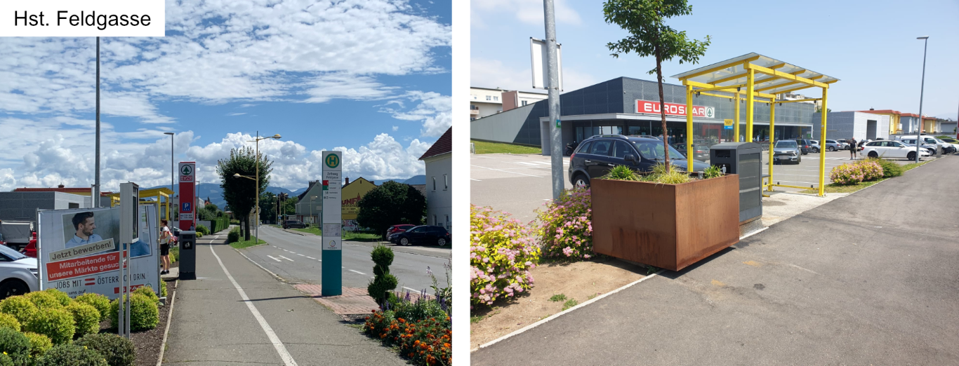 Ein neu installiertes Informations- und Leitsystem mit Wegweisern und Distanz-/Zeitangaben sorgt künftig für eine bessere Orientierung im Stadtgebiet und soll zum Gehen motivieren. Darüber hinaus wurde die Bushaltestelle Feldgasse durch einen Pflanztrog mit Baum und eine Sonnenschutzfolie beim Glaswartehaus aufgewertet. So soll der Aufenthalt auch an heißen Tagen angenehmer werden.